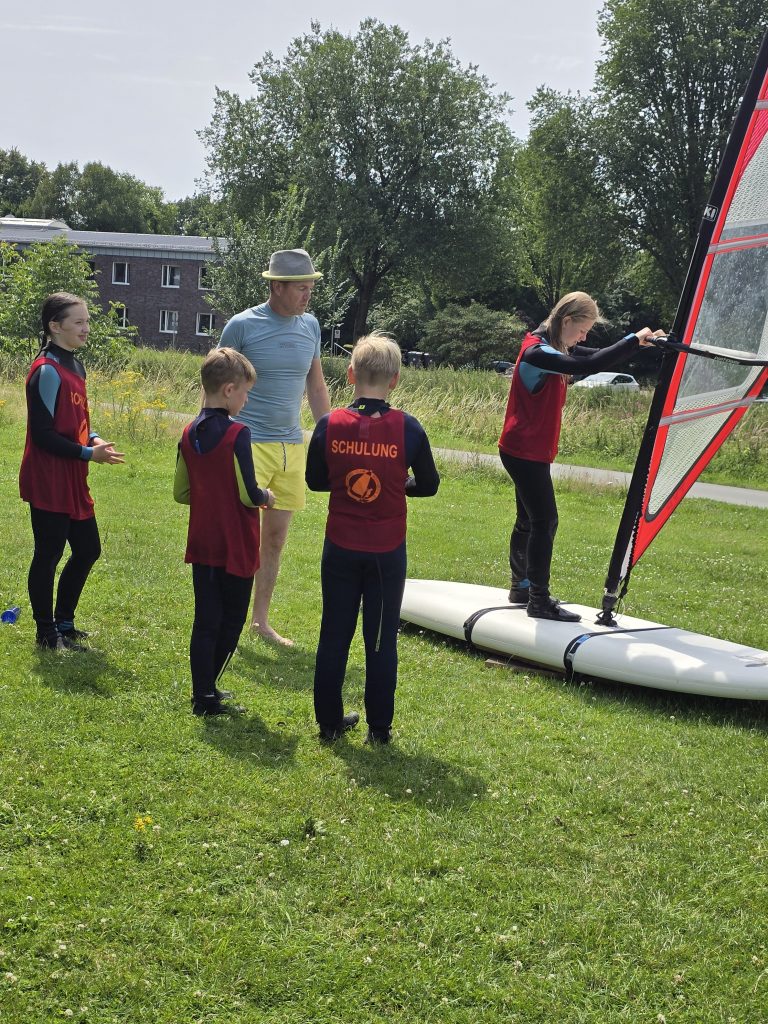 Beim Windsurfen empfehlen wir den Einstieg für Kinder ab 11 Jahren. Dafür beziehen wir vom DSV spezielle kindergerechte Lehrhefte, die im Unterricht eingesetzt werden. Der Jüngstenschein gilt bis 15 Jahre, dann kann durch Absolvieren der Theorieprüfung für Erwachsene der offizielle DSV-Grundschein abgelegt werden.